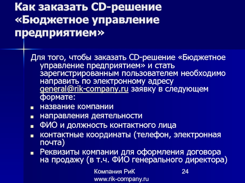 Для того, чтобы заказать CD-решение «Бюджетное управление предприятием» и стать зарегистрированным пользователем необходимо направить по электронному адресу general@rik-company.ru заявку в следующем формате: