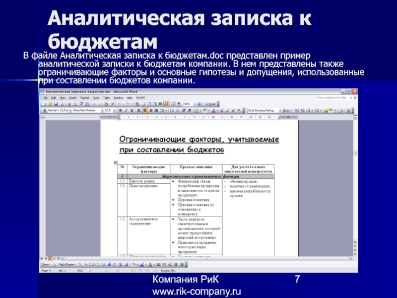 В файле Аналитическая записка к бюджетам.doc представлен пример аналитической записки к бюджетам компании. В нем представлены также ограничивающие факторы и основные гипотезы и допущения, использованные при составлении бюджетов компании.