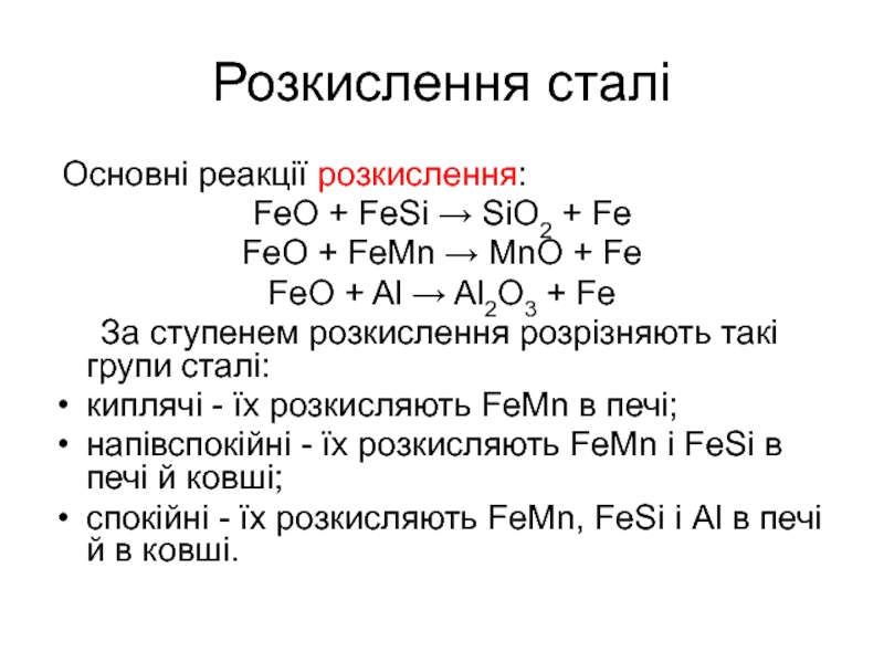 спокійні - їх розкисляють FeMn, FeSi і Al в печі й в ковші.