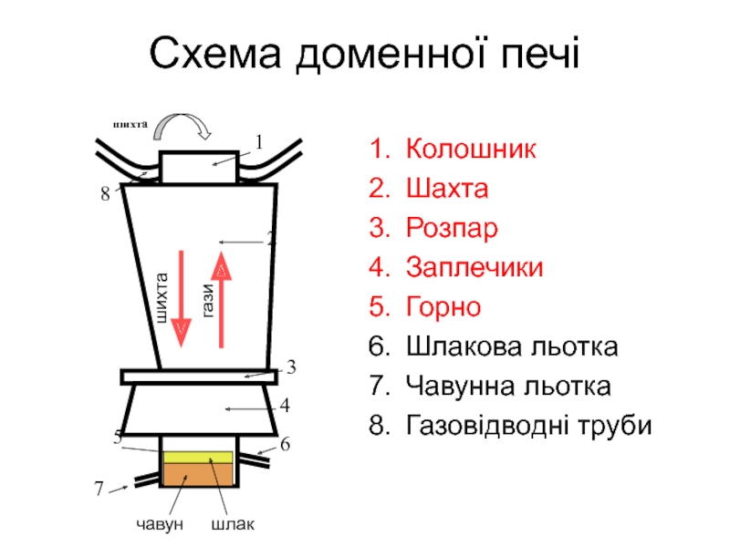 Для цього за необхідністю до неї завантажують окремими порціями (колошами) шихтові матеріали, периодично випускають чавун і шлак, безперервно видаляють доменні гази.