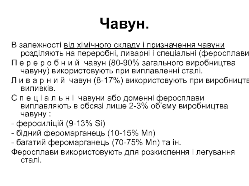 С п е ц і а л ь н і чавуни або доменні феросплави виплавляють в обсязі лише 2-3% об’єму виробництва чавуну :