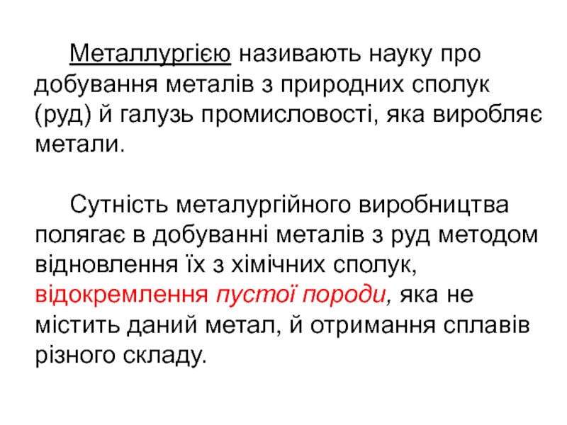Сутність металургійного виробництва полягає в добуванні металів з руд методом відновлення їх з хімічних сполук, відокремлення пустої породи, яка не містить даний метал, й отримання сплавів різного складу.