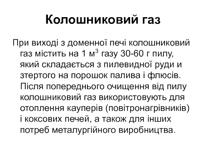 м3 газу 30-60 г пилу, який складається з пилевидної руди и зтертого на порошок палива і флюсів. Після попереднього очищення від пилу колошниковий газ використовують для отоплення кауперів (повітронагрівників) і коксових печей, а також для інших потреб металургійного виробництва.