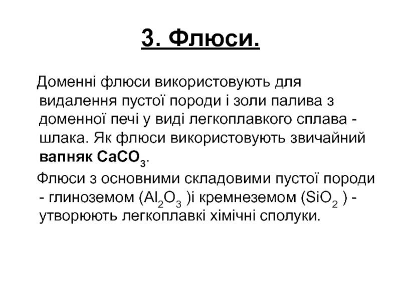 золи палива з доменної печі у виді легкоплавкого сплава - шлака. Як флюси використовують звичайний вапняк СаСО3.