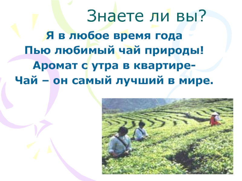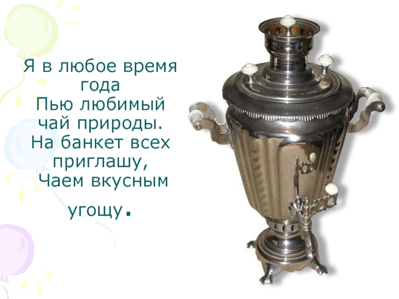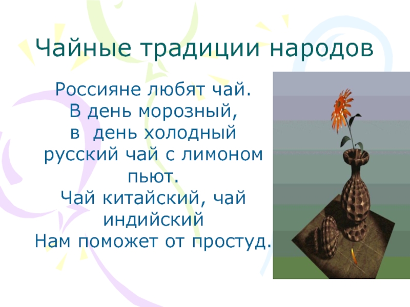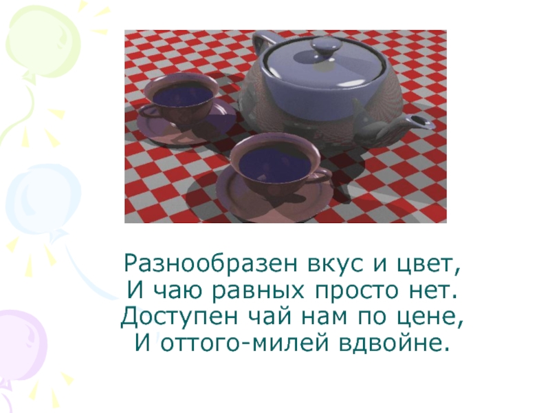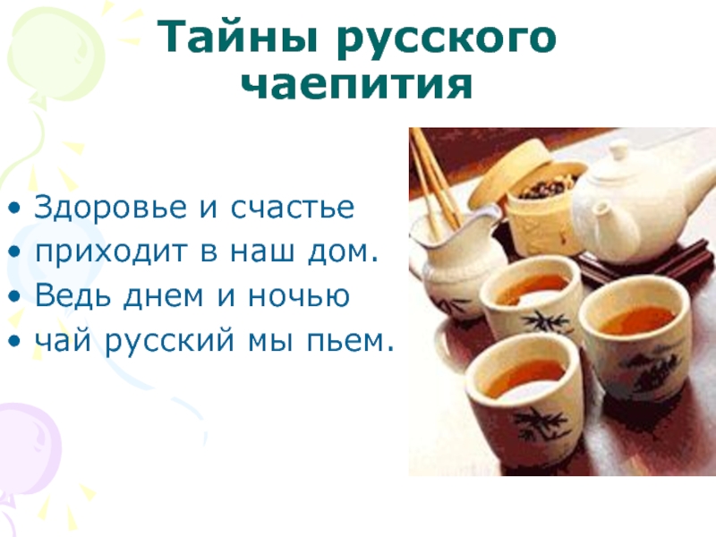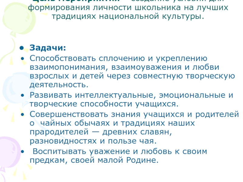 Совершенствовать знания учащихся и родителей о чайных обычаях и традициях наших прародителей — древних славян, разновидностях и пользе чая.