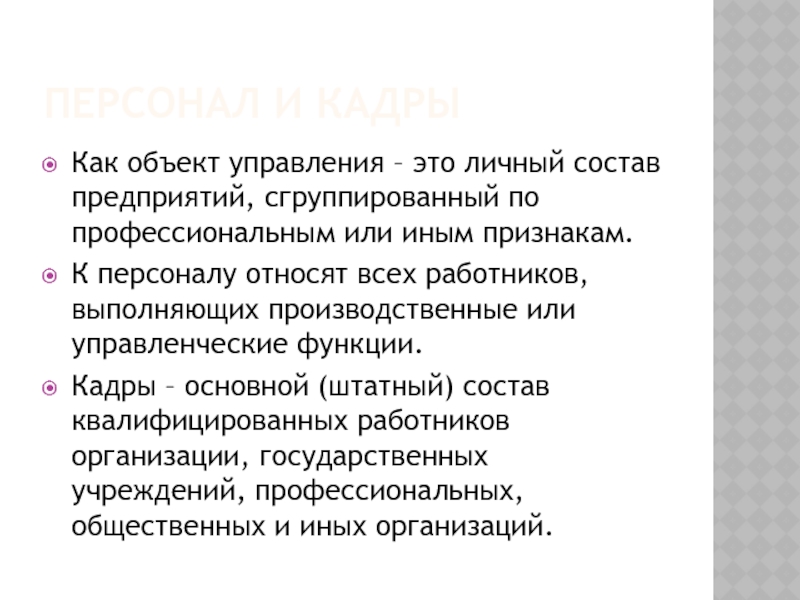 Кадры – основной (штатный) состав квалифицированных работников организации, государственных учреждений, профессиональных, общественных и иных организаций.