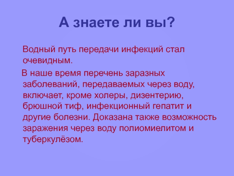 В наше время перечень заразных заболеваний, передаваемых через воду, включает, кроме холеры, дизентерию, брюшной тиф, инфекционный гепатит и другие болезни. Доказана также возможность заражения через воду полиомиелитом и туберкулёзом.