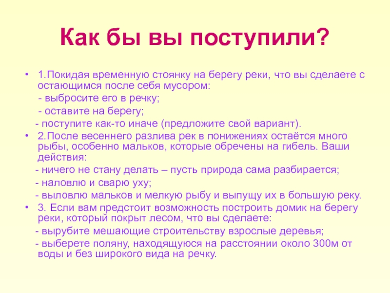 2.После весеннего разлива рек в понижениях остаётся много рыбы, особенно мальков, которые обречены на гибель. Ваши действия:
