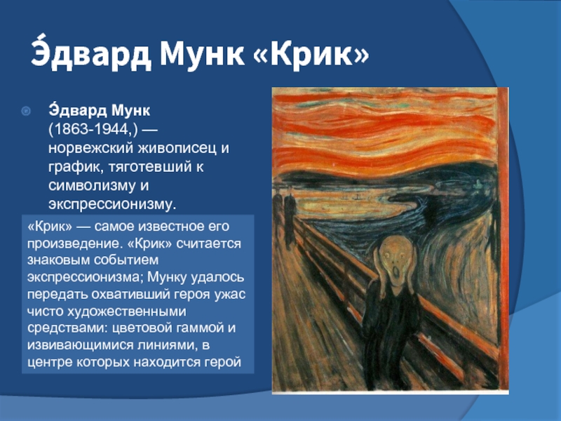 «Крик» — самое известное его произведение. «Крик» считается знаковым событием экспрессионизма; Мунку удалось передать охвативший героя ужас чисто художественными средствами: цветовой гаммой и извивающимися линиями, в центре которых находится герой