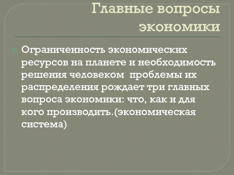 человеком проблемы их распределения рождает три главных вопроса экономики: что, как и для кого производить.(экономическая система)