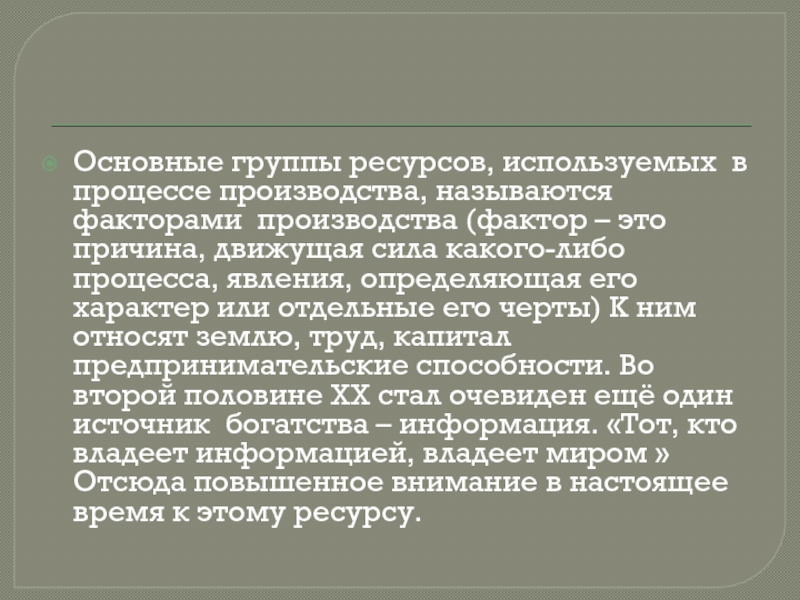 – это причина, движущая сила какого-либо процесса, явления, определяющая его характер или отдельные его черты) К ним относят землю, труд, капитал предпринимательские способности. Во второй половине XX стал очевиден ещё один источник богатства – информация. «Тот, кто владеет информацией, владеет миром » Отсюда повышенное внимание в настоящее время к этому ресурсу.
