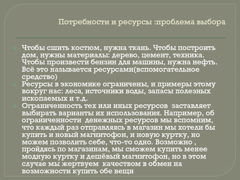 Ограниченность тех или иных ресурсов заставляет выбирать варианты их использования. Например, об ограниченности денежных ресурсов мы вспомним, что каждый раз отправляясь в магазин мы хотели бы купить и новый магнитофон, и новую куртку, но можем позволить себе, что-то одно. Возможно , пройдясь по магазинам, мы сможем купить менее модную куртку и дешёвый магнитофон, но в этом случае мы жертвуем качеством в обмен на возможности купить обе вещи