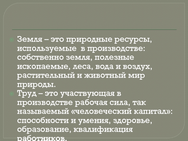 Труд – это участвующая в производстве рабочая сила, так называемый «человеческий капитал»: способности и умения, здоровье, образование, квалификация работников.