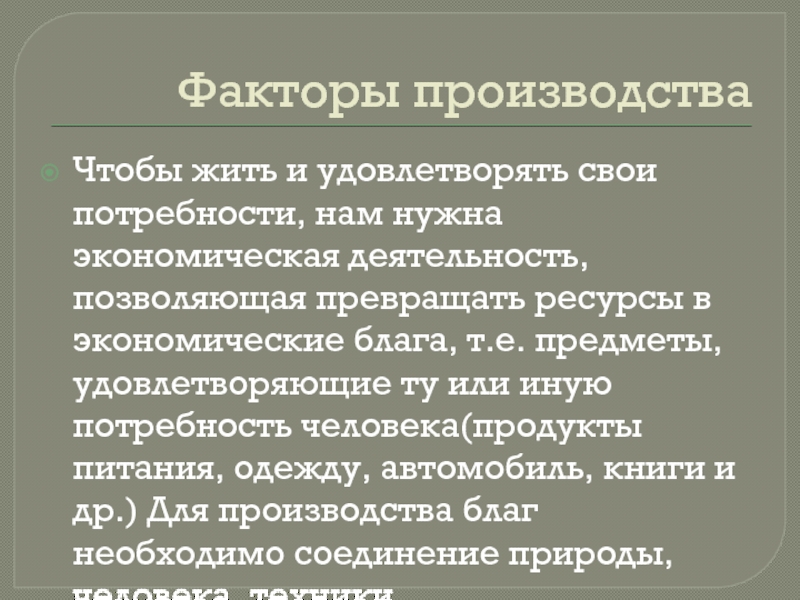 Основные группы ресурсов, используемых в процессе производства, называются факторами производства (фактор
