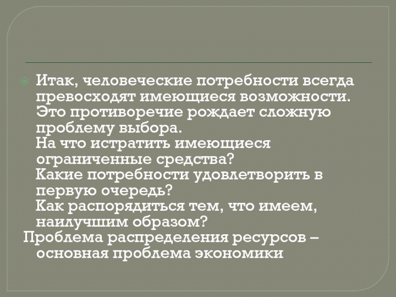Итак, человеческие потребности всегда превосходят имеющиеся возможности. Это противоречие рождает сложную