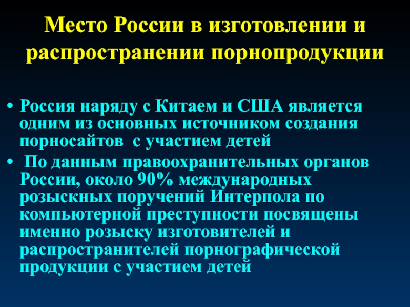 По данным правоохранительных органов России, около 90% международных розыскных поручений Интерпола по компьютерной преступности посвящены именно розыску изготовителей и распространителей порнографической продукции с участием детей
