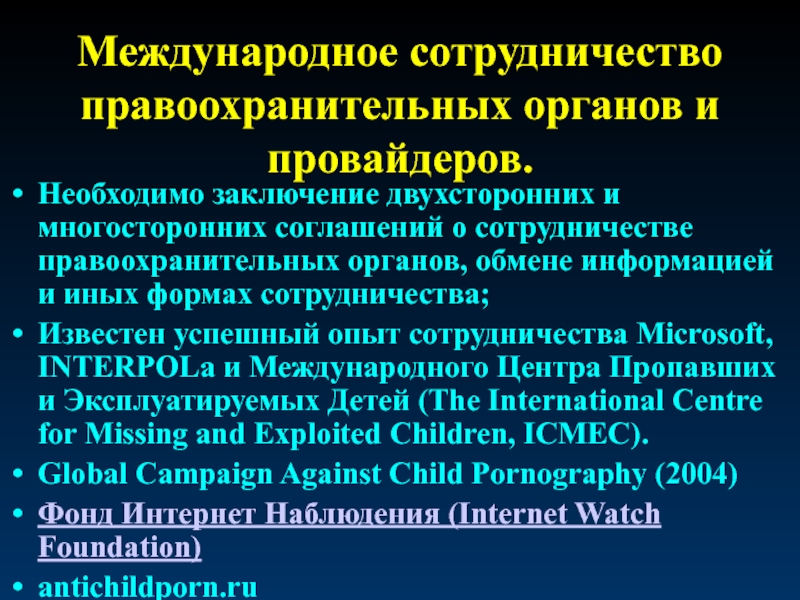 Слайд 21Международное сотрудничество правоохранительных органов и провайдеров.