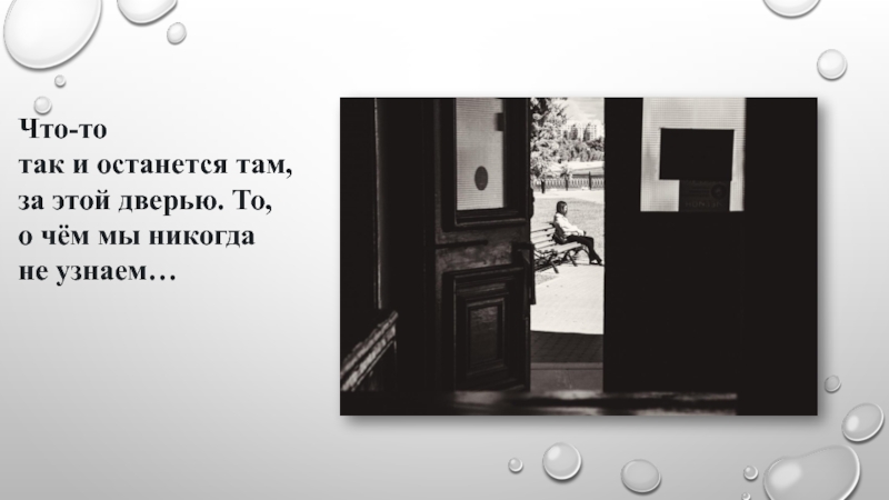 Слайд 12Что-то так и останется там, за этой дверью. То, о чём мы никогда не узнаем…