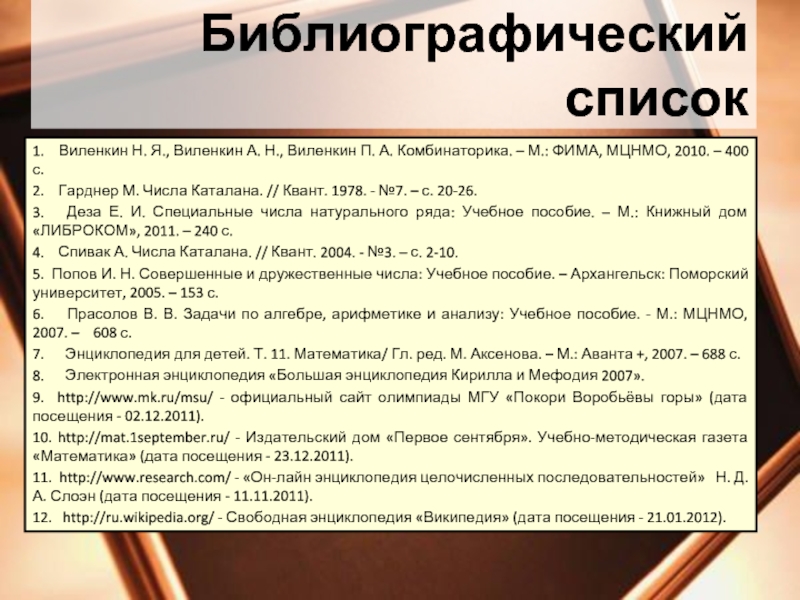 5. Попов И. Н. Совершенные и дружественные числа: Учебное пособие. – Архангельск: Поморский университет, 2005. – 153 с.