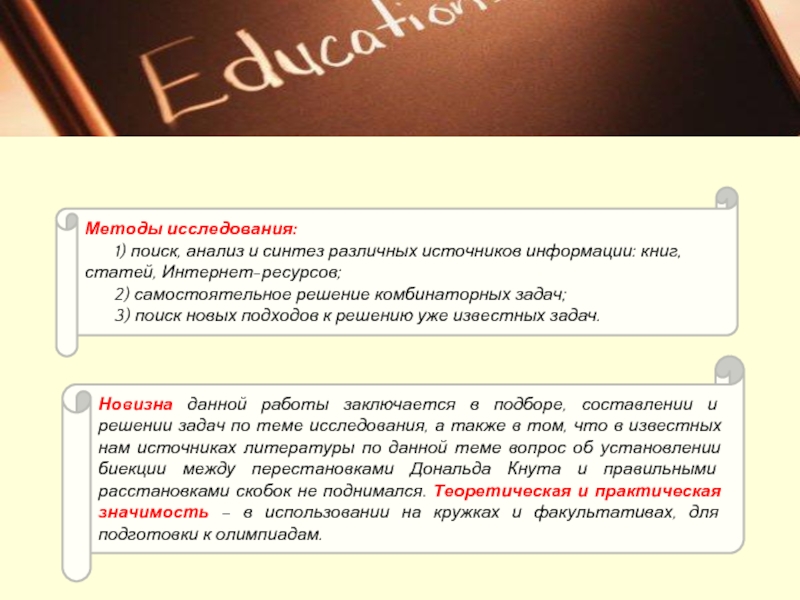теме исследования, а также в том, что в известных нам источниках литературы по данной теме вопрос об установлении биекции между перестановками Дональда Кнута и правильными расстановками скобок не поднимался. Теоретическая и практическая значимость – в использовании на кружках и факультативах, для подготовки к олимпиадам.