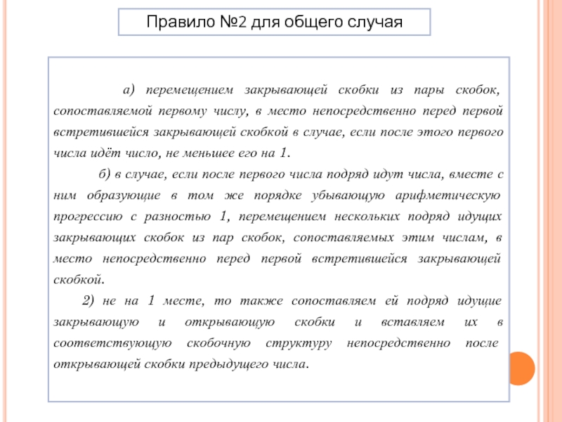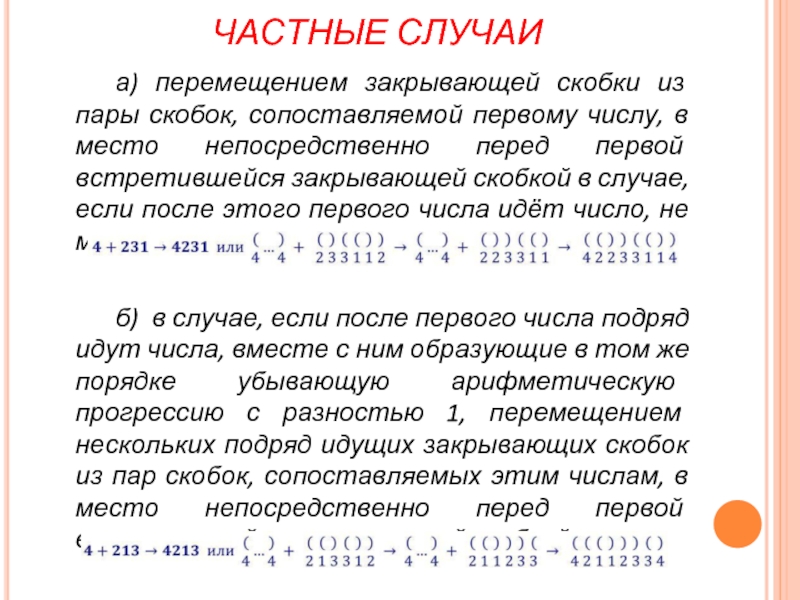 б) в случае, если после первого числа подряд идут числа, вместе с ним образующие в том же порядке убывающую арифметическую прогрессию с разностью 1, перемещением нескольких подряд идущих закрывающих скобок из пар скобок, сопоставляемых этим числам, в место непосредственно перед первой встретившейся закрывающей скобкой.