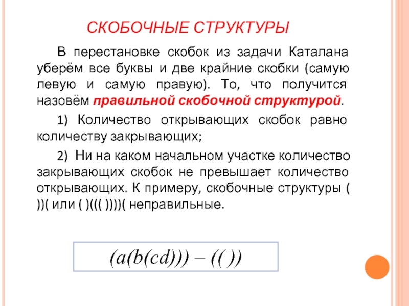 две крайние скобки (самую левую и самую правую). То, что получится назовём правильной скобочной структурой.