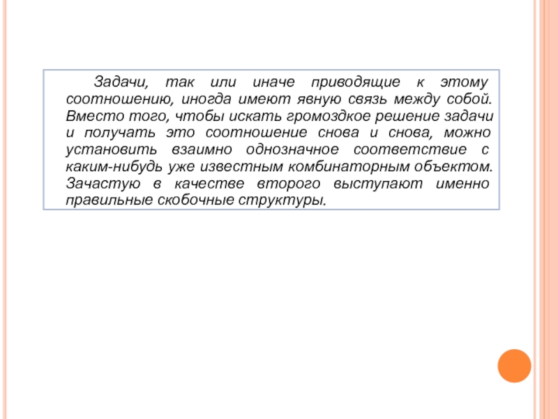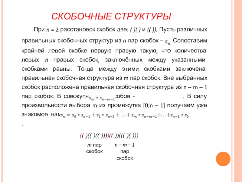 и (( )). Пусть различных правильных скобочных структур из n пар скобок – . Сопоставим крайней левой скобке первую правую такую, что количества левых и правых скобок, заключённых между указанными скобками равны. Тогда между этими скобками заключена правильная скобочная структура из m пар скобок. Вне выбранных скобок расположена правильная скобочная структура из n – m – 1 пар скобок. В совокупности способов - . В силу произвольности выбора m из промежутка [0;n – 1] получаем уже знакомое нам реккурентное соотношение: .