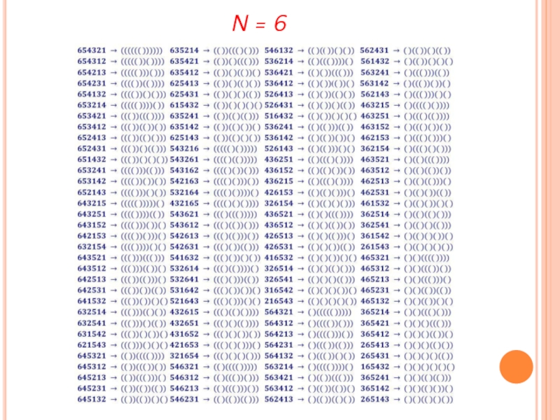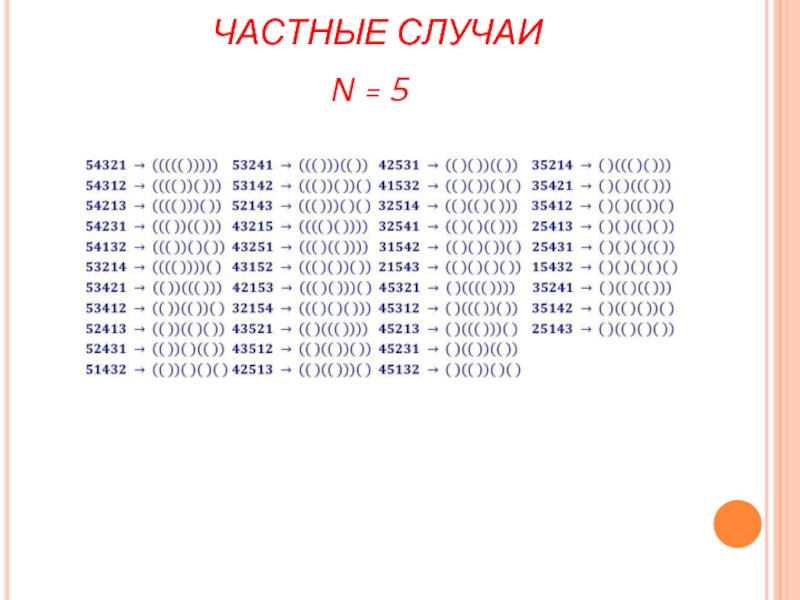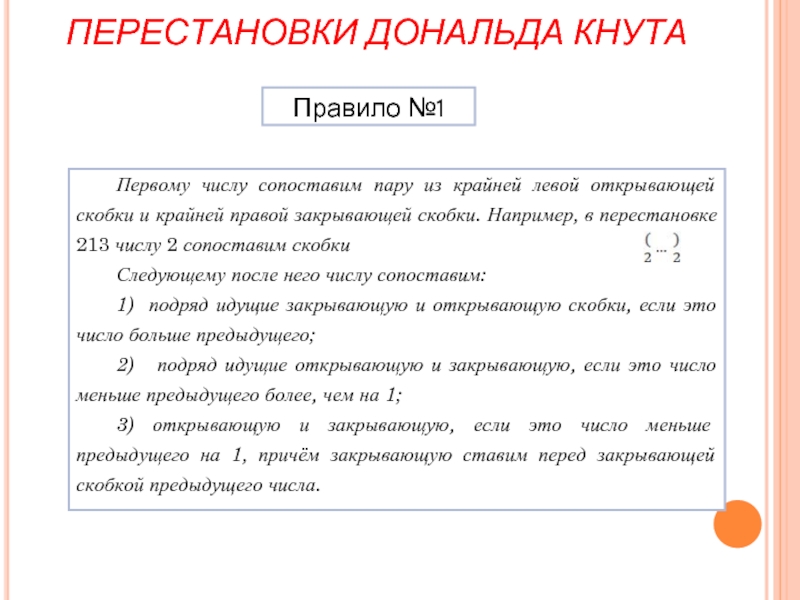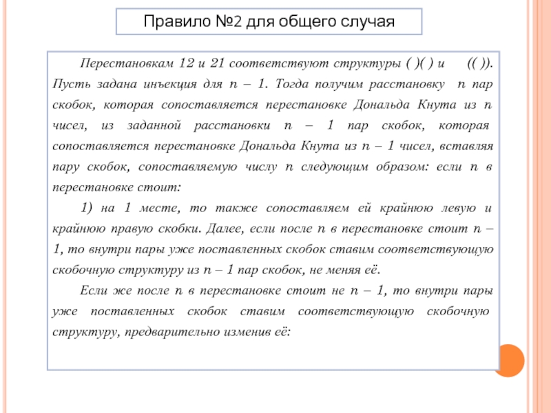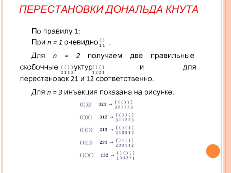 )( ) и (( )). Пусть задана инъекция для n – 1. Тогда получим расстановку n пар скобок, которая сопоставляется перестановке Дональда Кнута из n чисел, из заданной расстановки n – 1 пар скобок, которая сопоставляется перестановке Дональда Кнута из n – 1 чисел, вставляя пару скобок, сопоставляемую числу n следующим образом: если n в перестановке стоит: