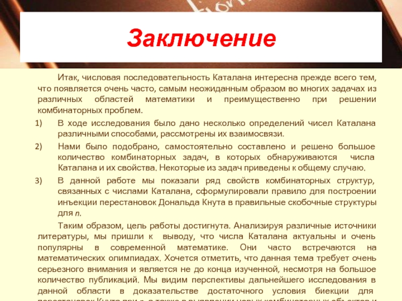 Таким образом, цель работы достигнута. Анализируя различные источники литературы, мы пришли к выводу, что числа Каталана актуальны и очень популярны в современной математике. Они часто встречаются на математических олимпиадах. Хочется отметить, что данная тема требует очень серьезного внимания и является не до конца изученной, несмотря на большое количество публикаций. Мы видим перспективы дальнейшего исследования в данной области в доказательстве достаточного условия биекции для перестановок Кнута при n, а также в выявлении новых комбинаторных объектов и их свойств, связанных с замечательной последовательностью Каталана.