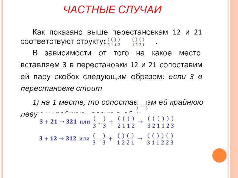 В зависимости от того на какое место вставляем 3 в перестановки 12 и 21 сопоставим ей пару скобок следующим образом: если 3 в перестановке стоит