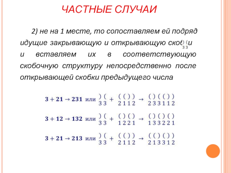 идущие закрывающую и открывающую скобки и вставляем их в соответствующую скобочную структуру непосредственно после открывающей скобки предыдущего числа
