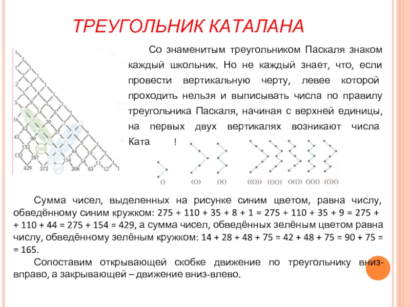 Сумма чисел, выделенных на рисунке синим цветом, равна числу, обведённому синим кружком: 275 + 110 + 35 + 8 + 1 = 275 + 110 + 35 + 9 = 275 + + 110 + 44 = 275 + 154 = 429, а сумма чисел, обведённых зелёным цветом равна числу, обведённому зелёным кружком: 14 + 28 + 48 + 75 = 42 + 48 + 75 = 90 + 75 = = 165.