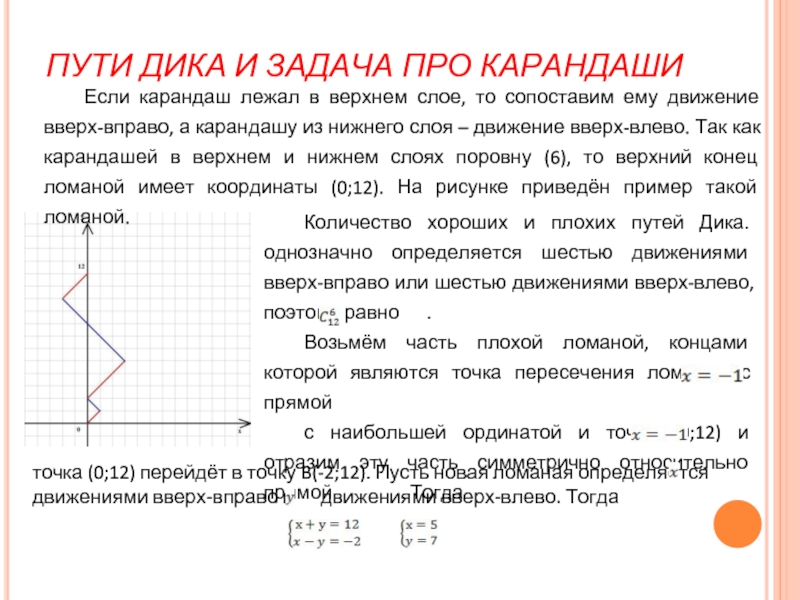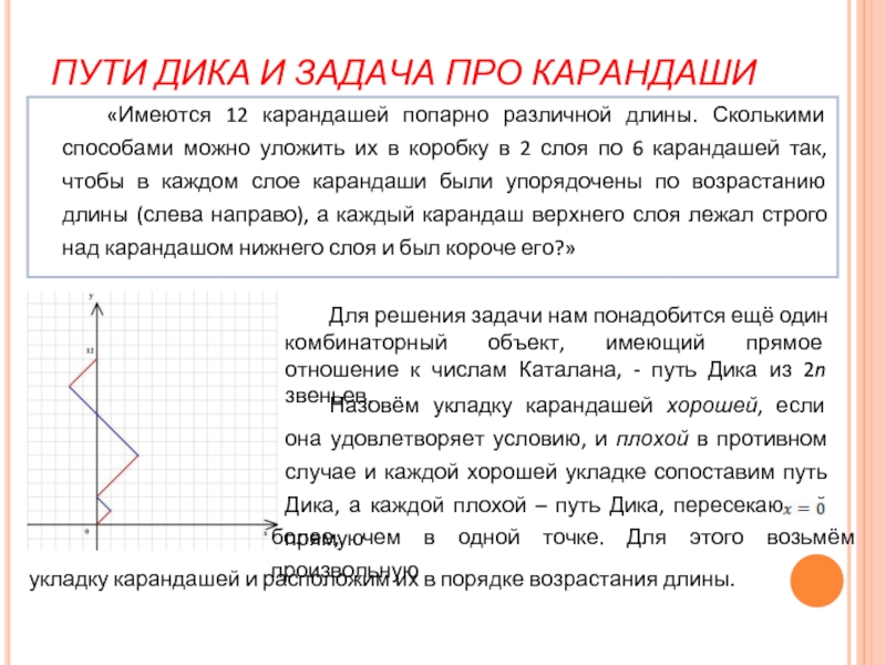 Назовём укладку карандашей хорошей, если она удовлетворяет условию, и плохой в противном случае и каждой хорошей укладке сопоставим путь Дика, а каждой плохой – путь Дика, пересекающий прямую