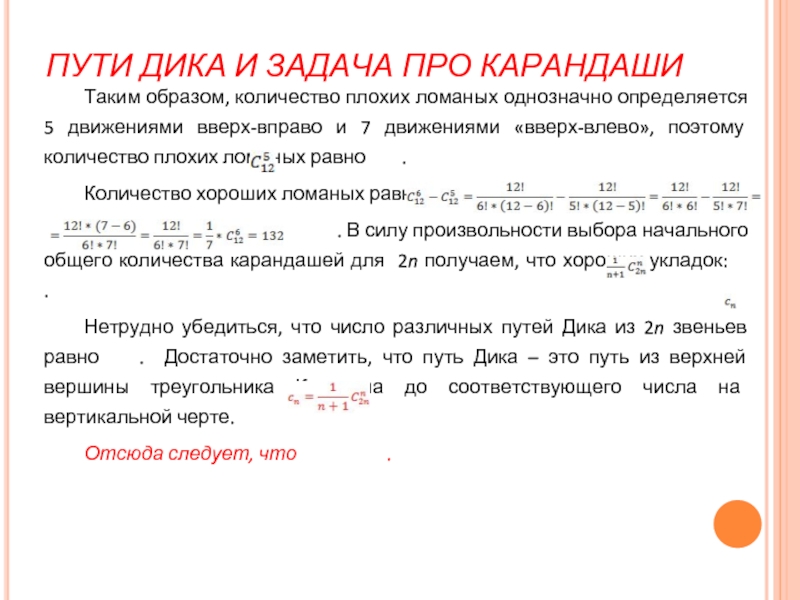 Нетрудно убедиться, что число различных путей Дика из 2n звеньев равно . Достаточно заметить, что путь Дика – это путь из верхней вершины треугольника Каталана до соответствующего числа на вертикальной черте.