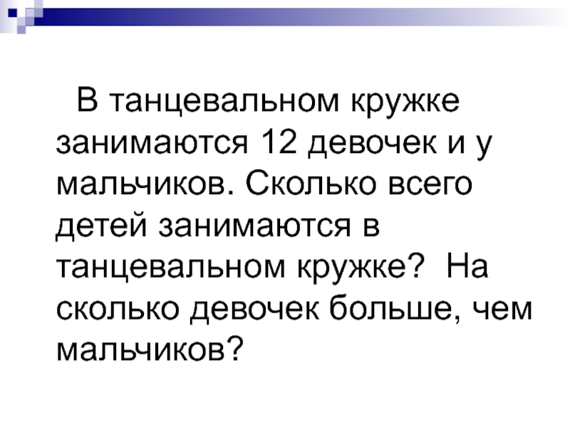 и y мальчиков. Сколько всего детей занимаются в танцевальном кружке? На сколько девочек больше, чем мальчиков?