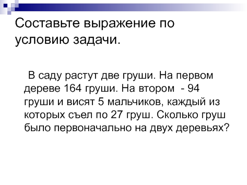 В саду растут две груши. На первом дереве 164 груши. На втором - 94 груши и висят 5 мальчиков, каждый из которых съел по 27 груш. Сколько груш было первоначально на двух деревьях?