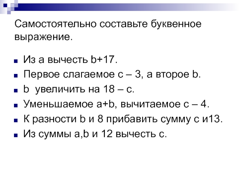 Слайд 7Самостоятельно составьте буквенное выражение.