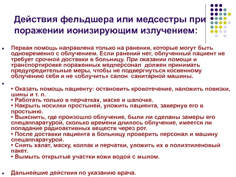 Слайд 21Действия фельдшера или медсестры при поражении ионизирующим излучением: