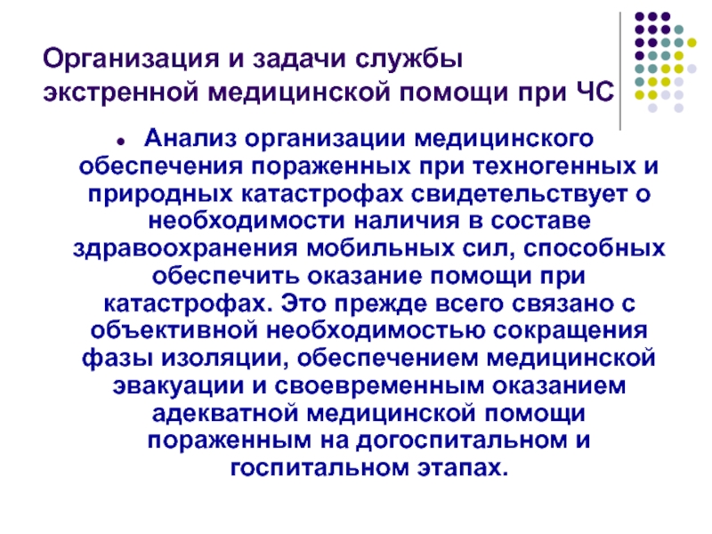 обеспечения пораженных при техногенных и природных катастрофах свидетельствует о необходимости наличия в составе здравоохранения мобильных сил, способных обеспечить оказание помощи при катастрофах. Это прежде всего связано с объективной необходимостью сокращения фазы изоляции, обеспечением медицинской эвакуации и своевременным оказанием адекватной медицинской помощи пораженным на догоспитальном и госпитальном этапах.