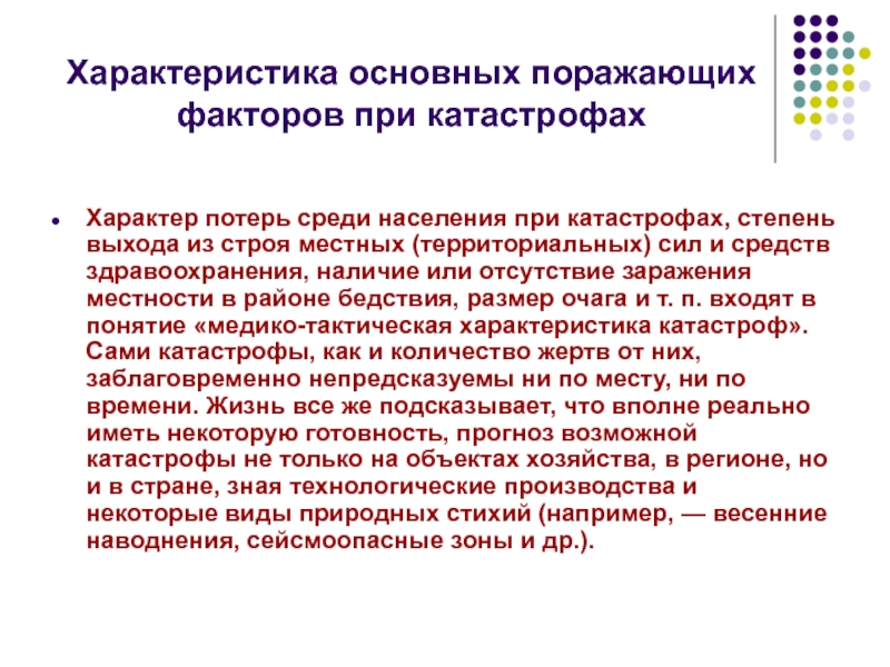 степень выхода из строя местных (территориальных) сил и средств здравоохранения, наличие или отсутствие заражения местности в районе бедствия, размер очага и т. п. входят в понятие «медико-тактическая характеристика катастроф». Сами катастрофы, как и количество жертв от них, заблаговременно непредсказуемы ни по месту, ни по времени. Жизнь все же подсказывает, что вполне реально иметь некоторую готовность, прогноз возможной катастрофы не только на объектах хозяйства, в регионе, но и в стране, зная технологические производства и некоторые виды природных стихий (например, — весенние наводнения, сейсмоопасные зоны и др.).