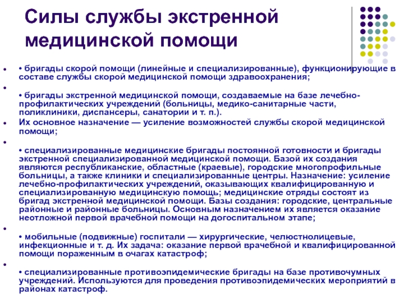 • бригады экстренной медицинской помощи, создаваемые на базе лечебно-профилактических учреждений (больницы, медико-санитарные части, поликлиники, диспансеры, санатории и т. п.).