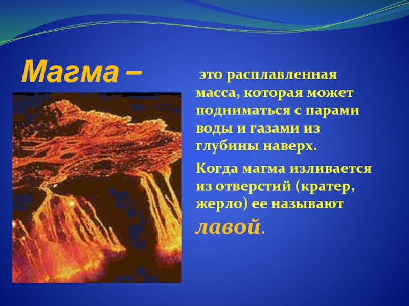 Когда магма изливается из отверстий (кратер, жерло) ее называют лавой.