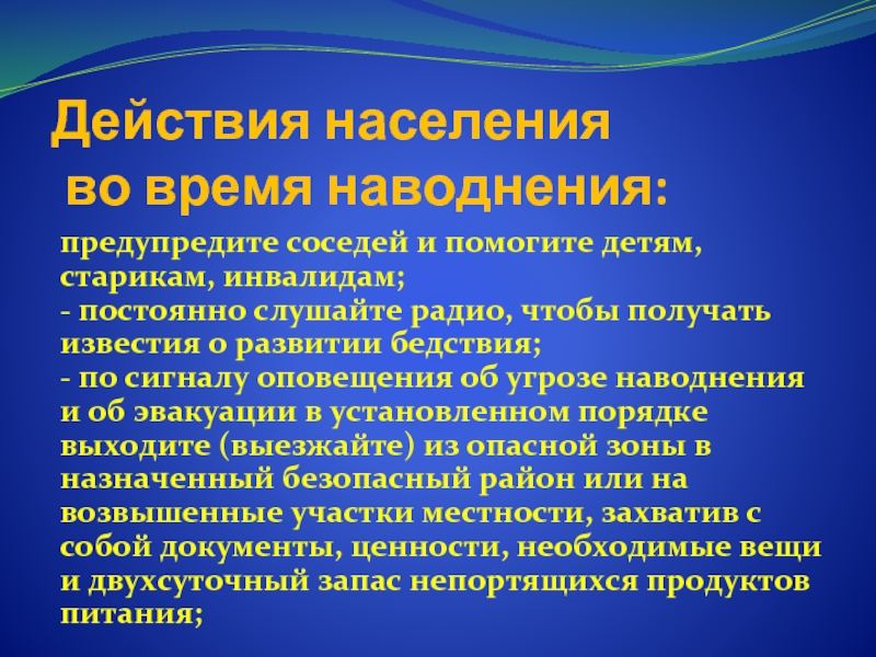 - по сигналу оповещения об угрозе наводнения и об эвакуации в установленном порядке выходите (выезжайте) из опасной зоны в назначенный безопасный район или на возвышенные участки местности, захватив с собой документы, ценности, необходимые вещи и двухсуточный запас непортящихся продуктов питания;
