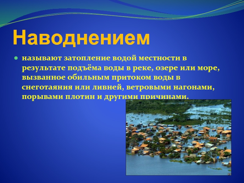 или море, вызванное обильным притоком воды в снеготаяния или ливней, ветровыми нагонами, порывами плотин и другими причинами.