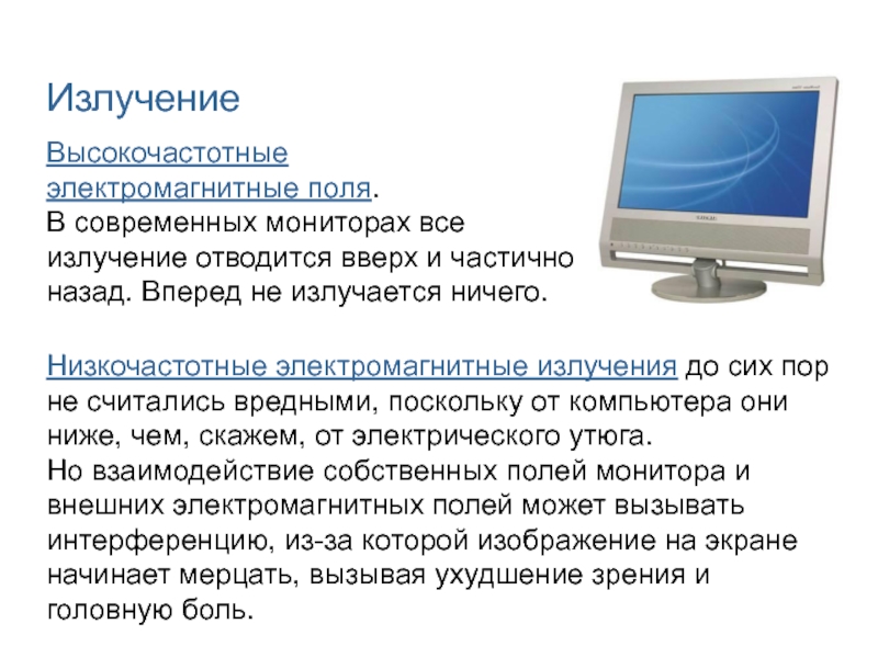 Низкочастотные электромагнитные излучения до сих пор не считались вредными, поскольку от компьютера они ниже, чем, скажем, от электрического утюга.