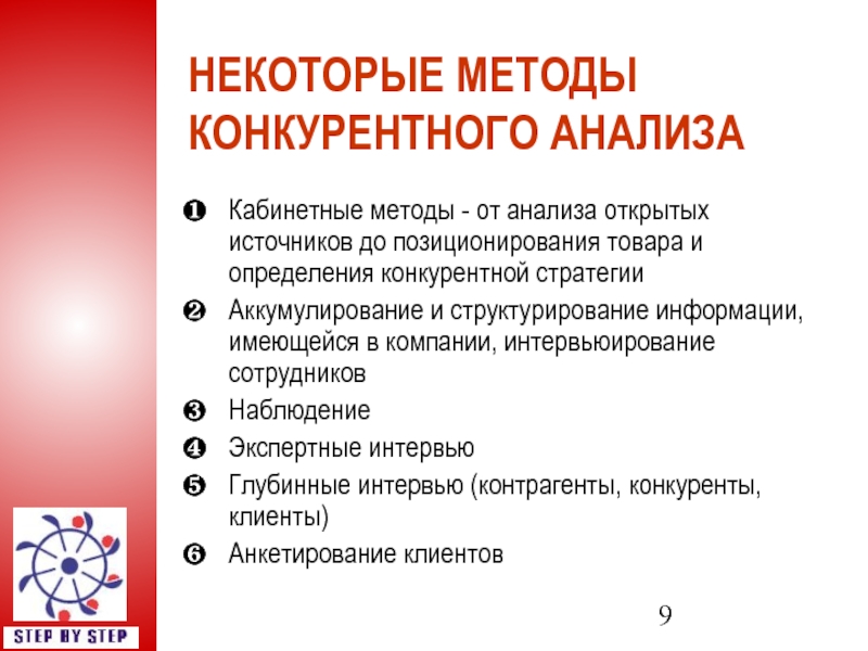 Слайд 9НЕКОТОРЫЕ МЕТОДЫ КОНКУРЕНТНОГО АНАЛИЗА