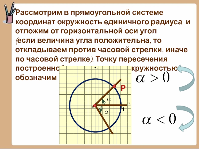 (если величина угла положительна, то откладываем против часовой стрелки, иначе по часовой стрелке). Точку пересечения построенной стороны угла с окружностью обозначим Р.
