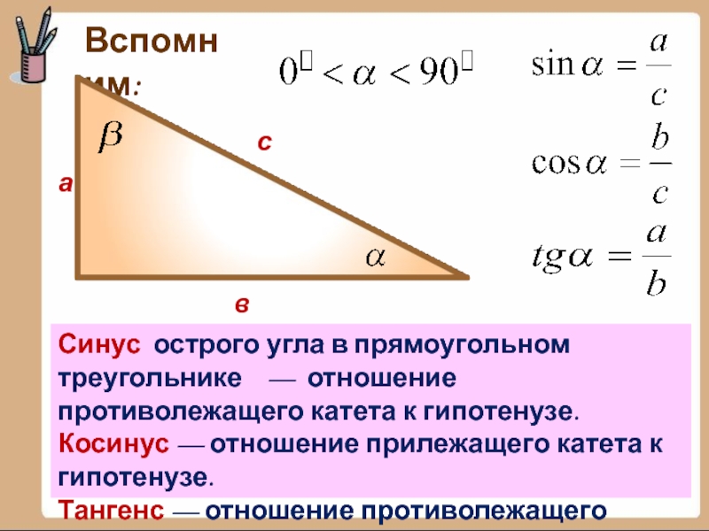 Слайд 7Тригонометрия – математическая дисциплина, изучающая зависимость между сторонами и углами треугольника.