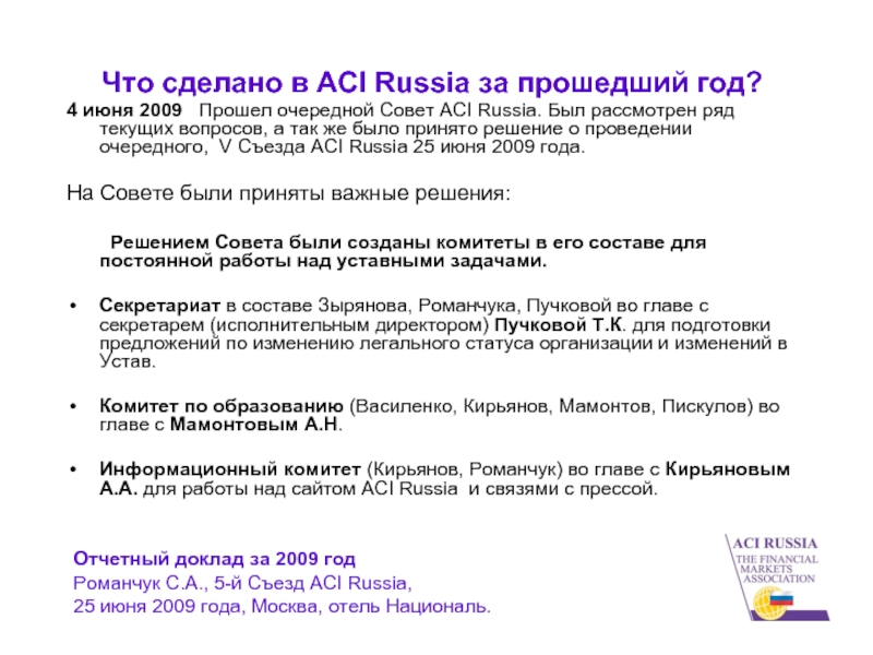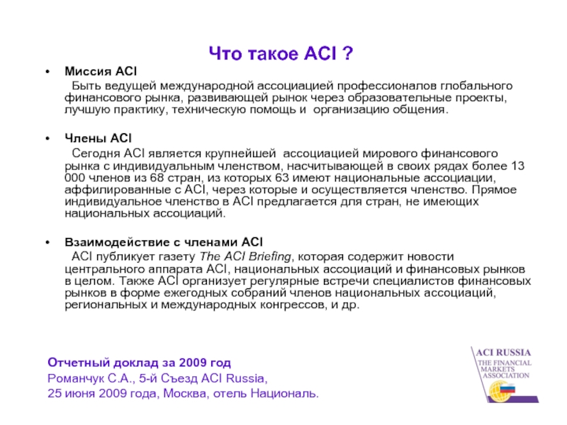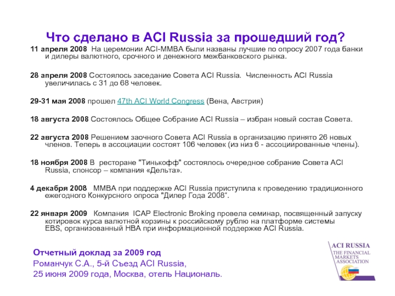 2009 Завершился 48 всемирный конгресс ACI -The Financial Markets Assoсiation в Кейптауне, ЮАР. В его работе приняли участие член Совета ACI Russia Дмитрий Пискулов и президент ACI Russia Сергей Романчук.