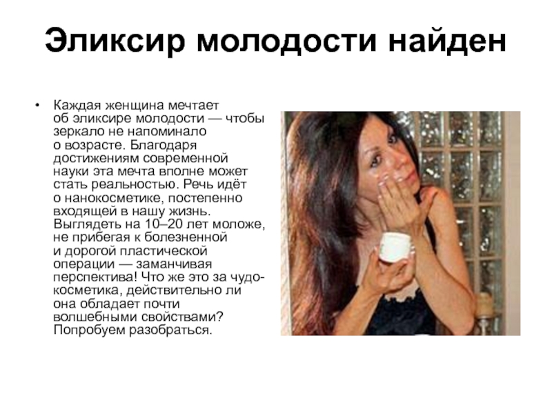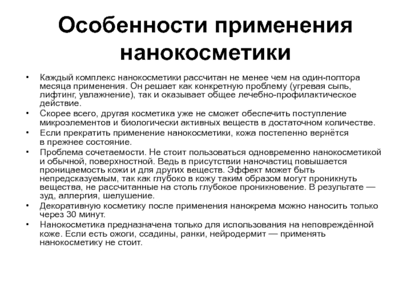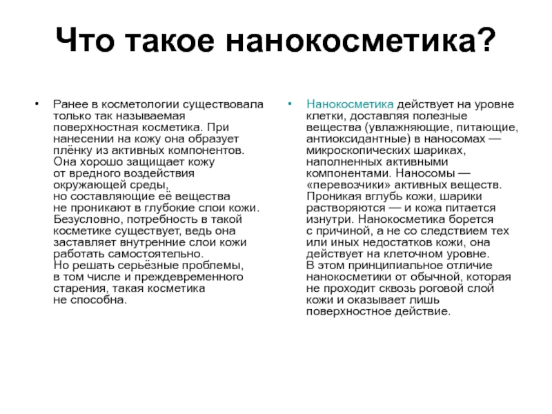 Нанокосметика действует на уровне клетки, доставляя полезные вещества (увлажняющие, питающие, антиоксидантные) в наносомах — микроскопических шариках, наполненных активными компонентами. Наносомы — «перевозчики» активных веществ. Проникая вглубь кожи, шарики растворяются — и кожа питается изнутри. Нанокосметика борется с причиной, а не со следствием тех или иных недостатков кожи, она действует на клеточном уровне. В этом принципиальное отличие нанокосметики от обычной, которая не проходит сквозь роговой слой кожи и оказывает лишь поверхностное действие.